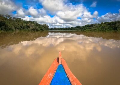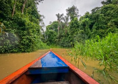 Day 2: On the second day, hike back to the road and return to Leticia by van. Before continuing the adventure, make a quick stop at the hostel, where you’ll have time to repack and prepare for the next two days in the jungle. After getting ready, take an exciting boat journey along the Amazon and Yavari Rivers to Sacambu Lodge, located in the flooded jungle between Brazil and Peru. Enjoy lunch, go boat fishing for piranhas, and explore the Yavari River in search of pink and gray river dolphins. Take a refreshing swim in a jungle lake, admire the sunset, and return to the lodge for dinner. As night falls, embark on a thrilling boat expedition to spot caimans and, depending on the season, enjoy a fascinating night walk through the flooded forest. The jungle truly comes alive after dark!